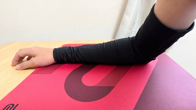 シームレス加工ではなかったり、ゴムが付いていたりと、Esports向けのアームカバーよりも細かい点で気になるところはあります。しかし、そこが気にならない人は試してみても良いかもしれませんね。