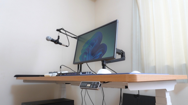 まずは、ゲーム環境の土台とも言える「デスク」を紹介します。僕が使用しているのは、Flexispot E7 Proという電動昇降デスクです。