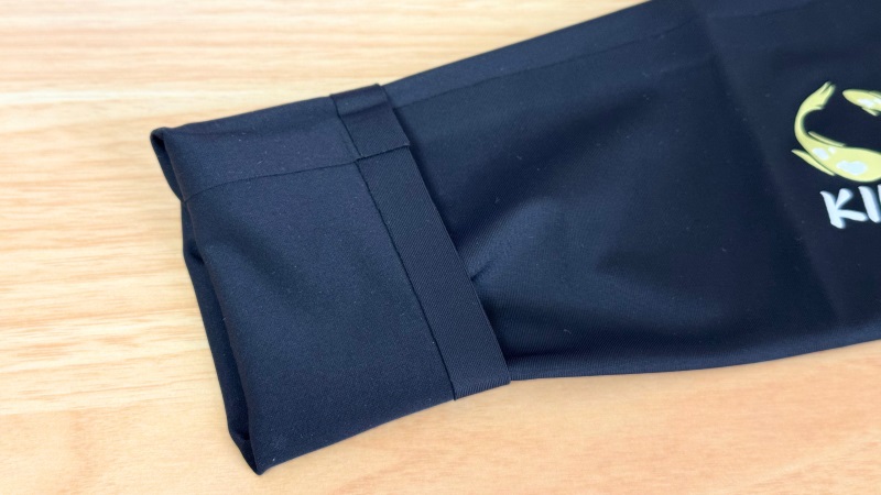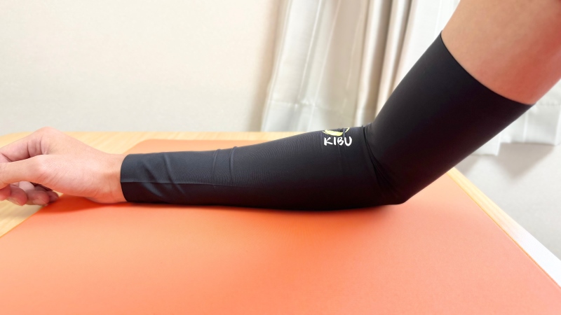 KIBUのアームカバーは手首緩め、前腕・上腕はぴちっとした着け心地です。伸縮性がやや少ないため、少し締まった感触がありますが、きつ過ぎるわけではありません。